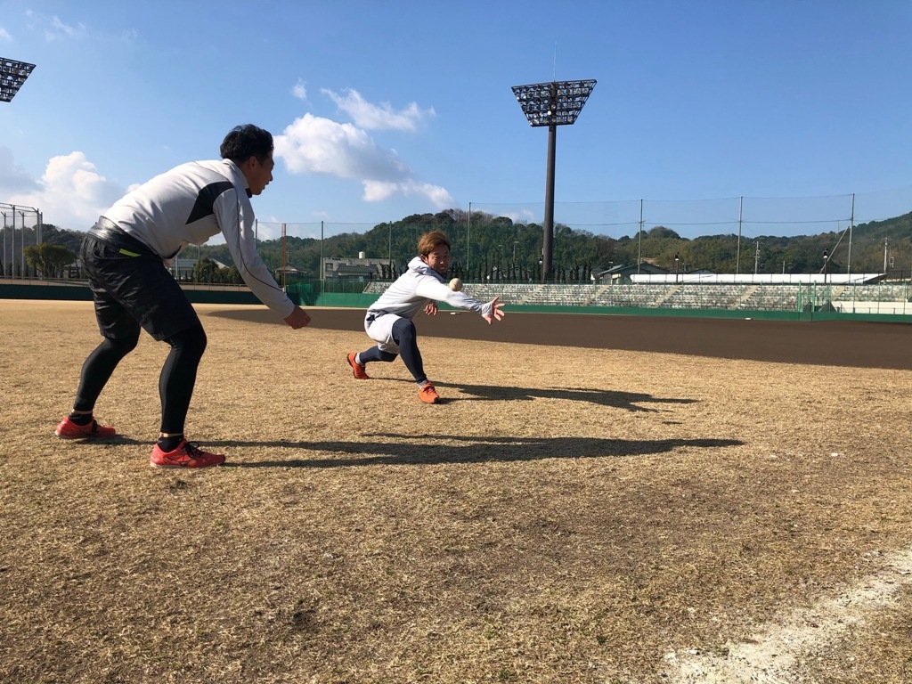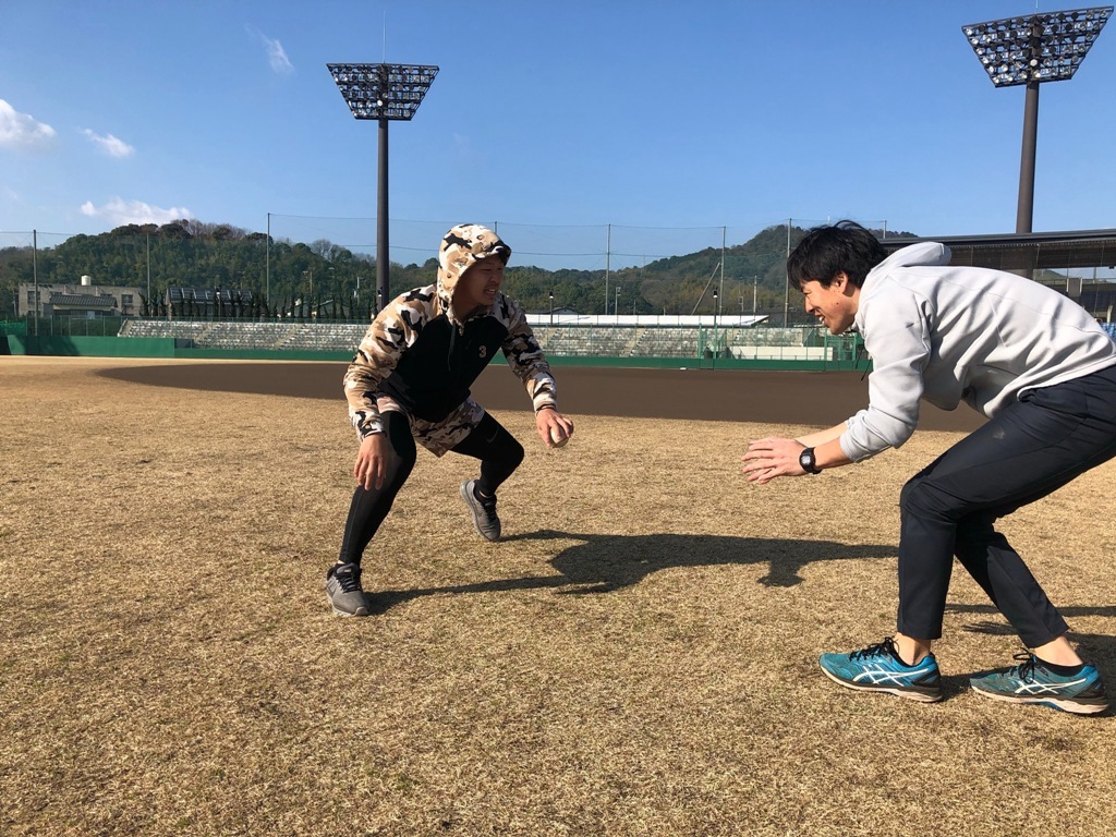 守備に必要な下半身を鍛えながらハンドスキルを上げるトレーニングを行う外崎修汰選手