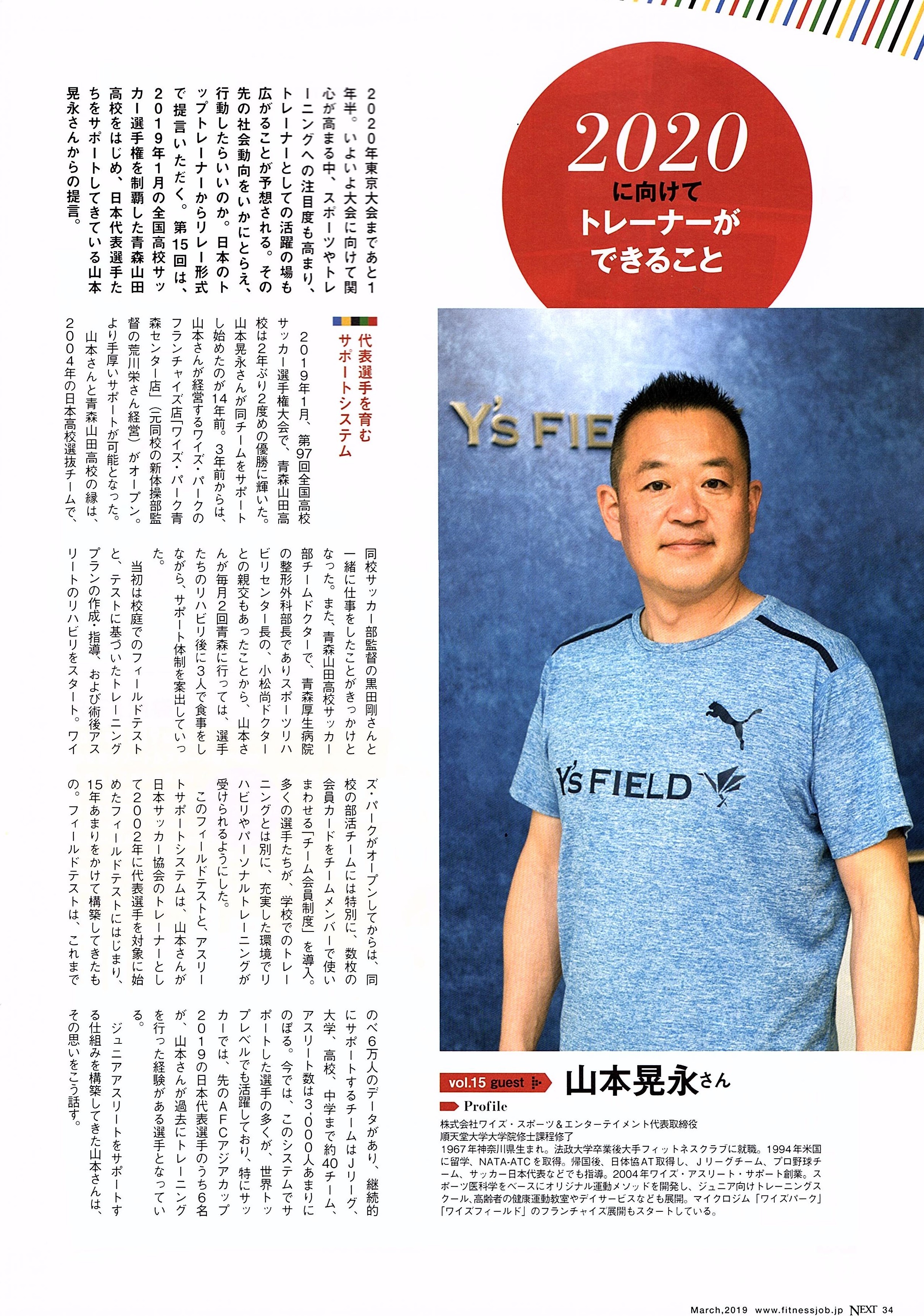 弊社代表の山本晃永が、日本を代表するトレーナー達が2020年の東京オリンピックに向けてどのような活動をしていくか、また東京オリンピック後のスポーツ産業、社会動向を見極めどのように事業展開していくかについて取材を受け、2019年3月に刊行された『月間NEXT 2020に向けてトレーナーができること』にその記事が掲載されました。
