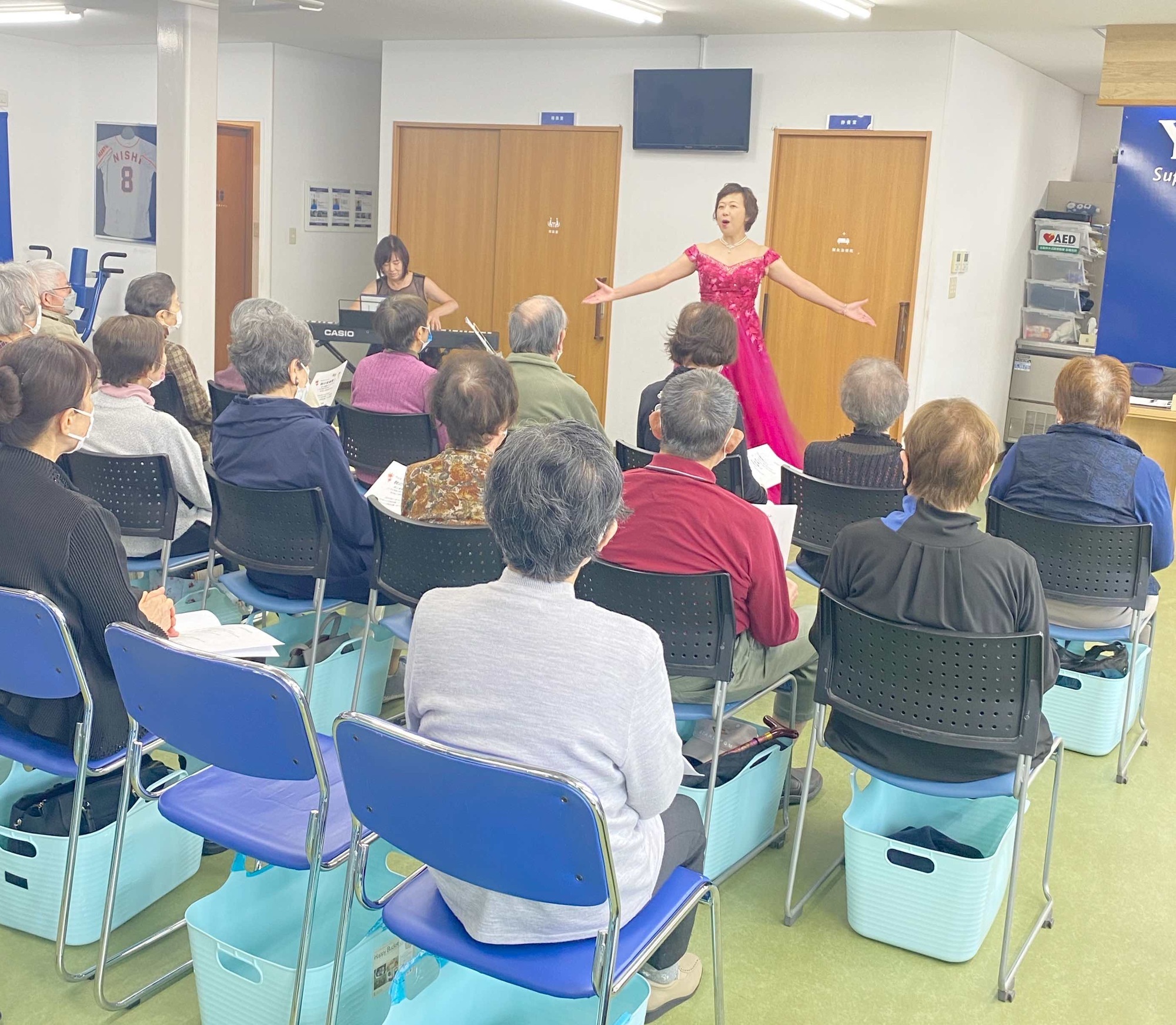 歌はエンタメプロデューサーの井上智恵、演奏はデイサービスでのエンタメ活動で使用する音源などでご協力をいただいている石川容子さんをゲストに開催。